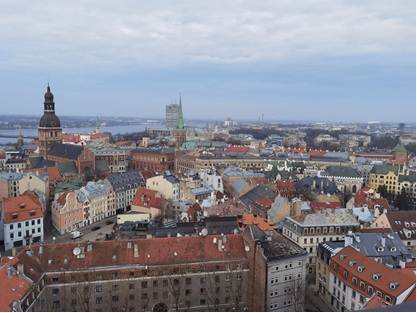 在教堂登顶后,老城尽收眼底,满目的红顶蓝墙,错落有致,还可以看到远处的道加瓦河、拉脱维亚科学院、里加铁路桥、中央市场,不愧是“北方的巴黎”。